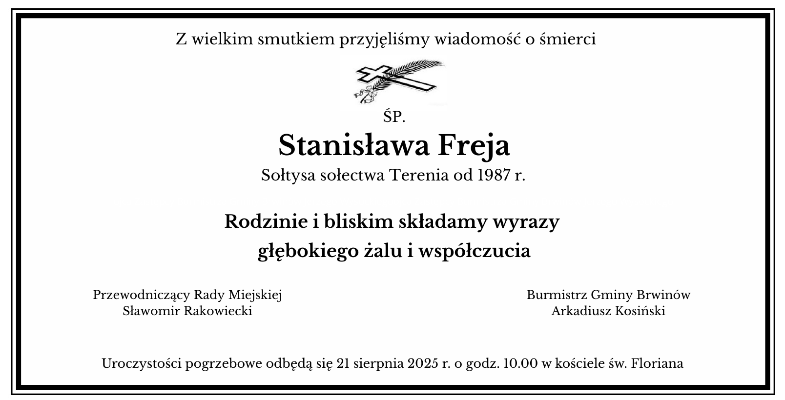 Uroczystości pogrzebowe odbędą się 21 sierpnia 2025 r. o godz. 10.00 w kościele św. Floriana. Po mszy św. nastąpi odprowadzenie urny z prochami na cmentarz parafialny.