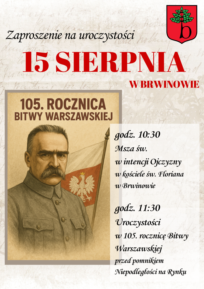 105 lat temu, na przedpolach Warszawy rozegrała się Bitwa Warszawska decydująca o losach wojny polsko-bolszewickiej. W dniu 15 sierpnia 2025 r. Brwinów uczci pamięć bohaterów walk z 1920 roku. Uroczystości rozpoczną się o godzinie 10.30 mszą św. w intencji Ojczyzny, która zostanie odprawiona w kościele pw. św. Floriana w Brwinowie. Następnie zgromadzeni udadzą się przed Pomnik Niepodległości, aby uczcić tych, którzy wykazali się odwagą, poświęceniem i bohaterstwem w obliczu zagrożenia ojczyzny, jako wyraz szacunku i wdzięczności za walkę o wolność i niepodległość.