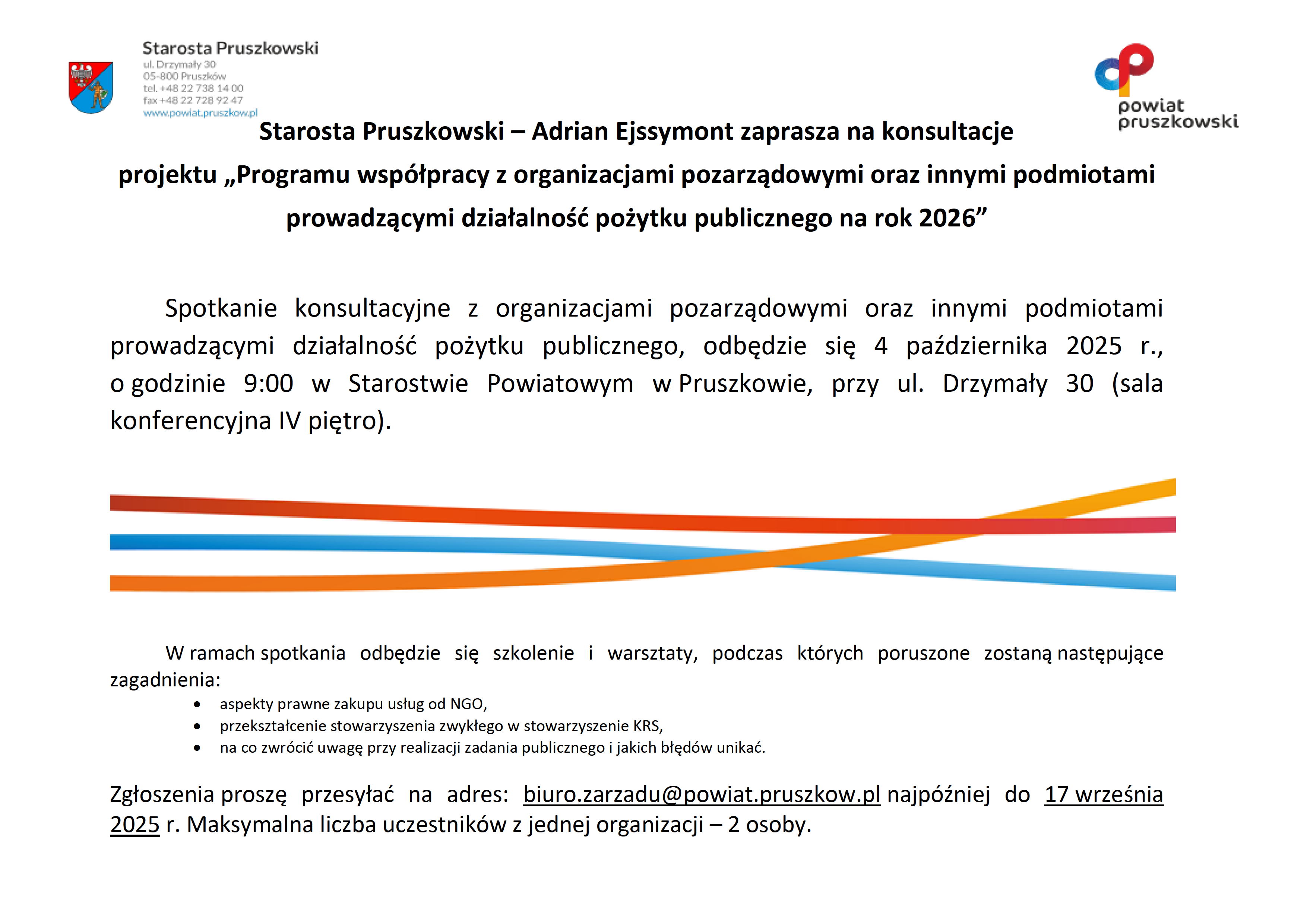Konsultacje projektu „Rocznego programy współpracy…” odbędą się w Starostwie Powiatowym 4 października 2025 r. o godz. 9.