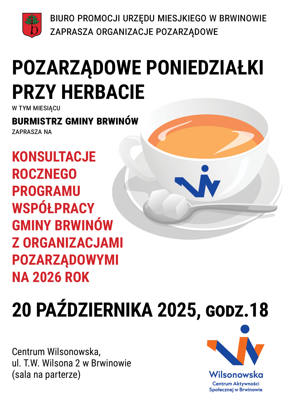 20 Paź18:00Pozarządowy poniedziałek przy herbacie - konsultacje rocznego programu współpracy Centrum Wilsonowska, ul. Wilsona 2, Brwinów