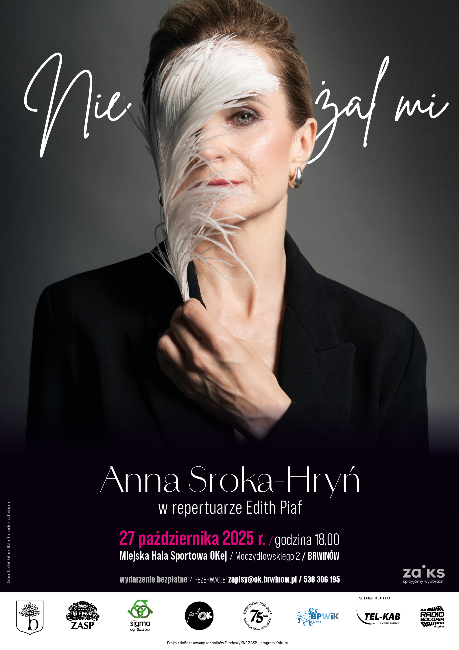 27 Paź18:00Koncert Anny Sroki-Hryń Nie żal mi Miejska Hala Sportowa, ul. Moczydłowskiego 2, Brwinów