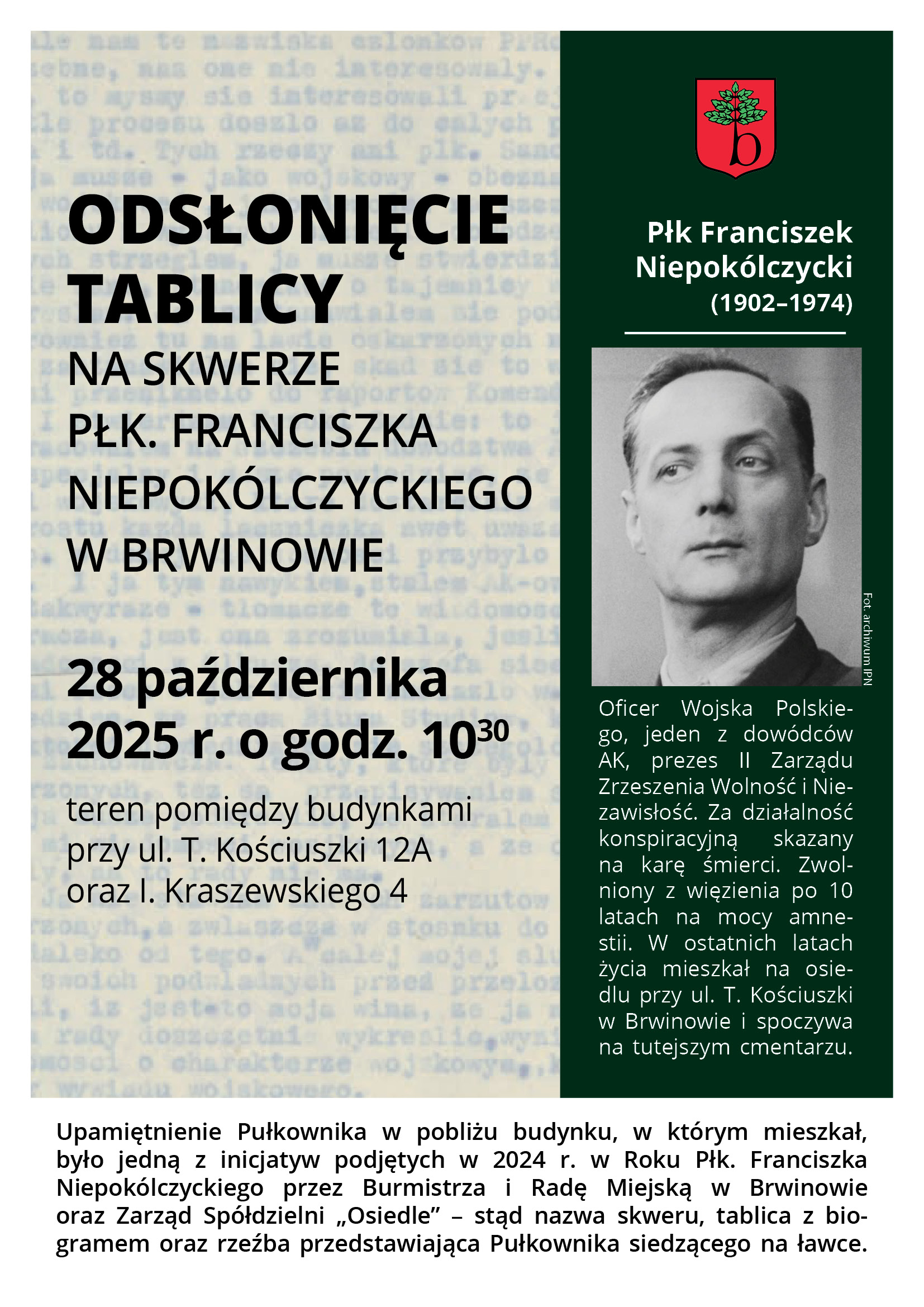 28 Paź10:30Odsłonięcie tablice płk. Niepokólczyckiego skwer płk. Niepokólczyckiego (między budynkami ul. Kraszewskiego 4 i Kościuszki 12A)