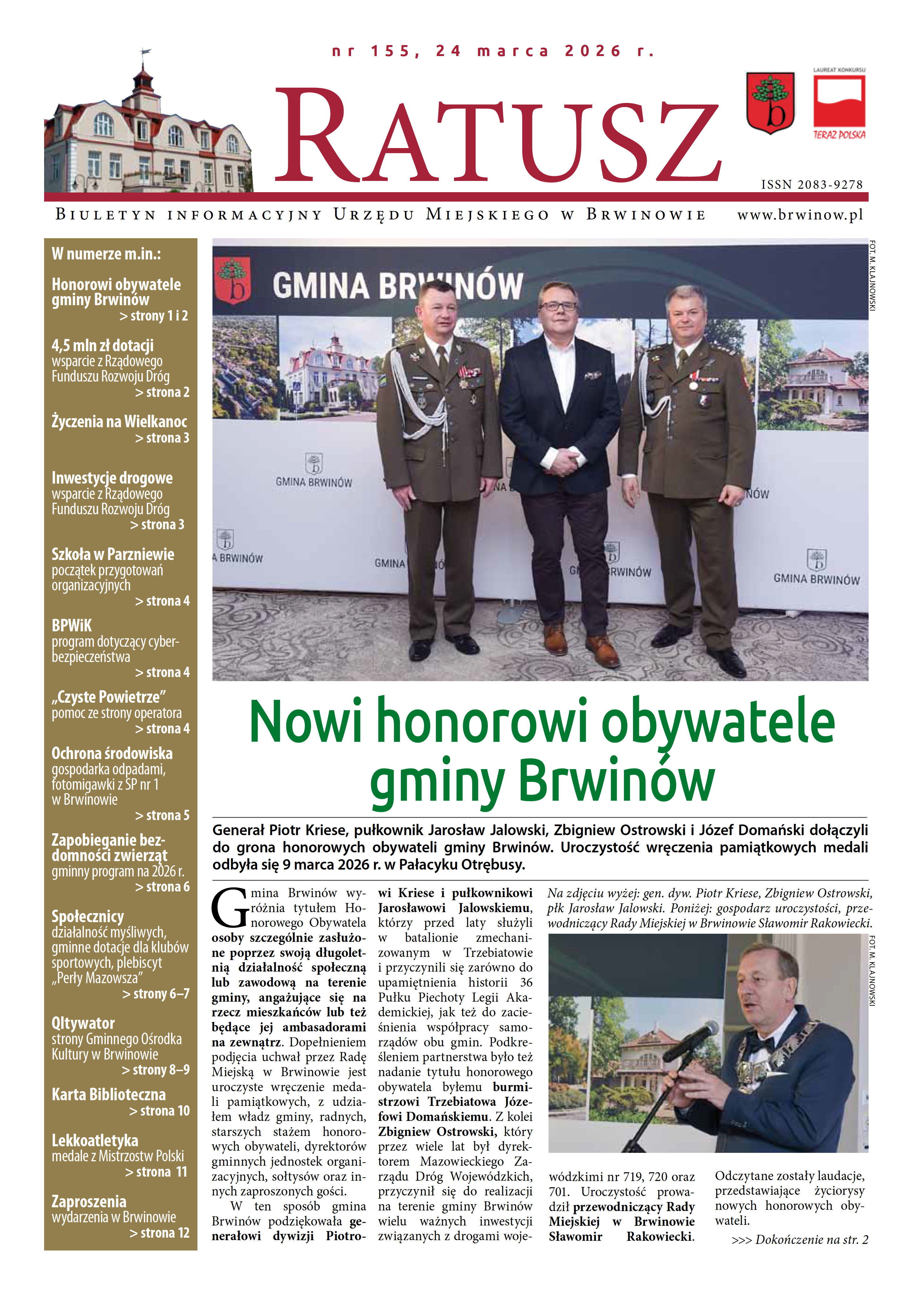 W marcowym biuletynie "Ratusz": nowi Honorowi Obywatele gminy Brwinów, inwestycje drogowe, informacje na temat szkoły w Parzniewie, podsumowanie akcji koła łowieckiego „Zima w kniei”.
